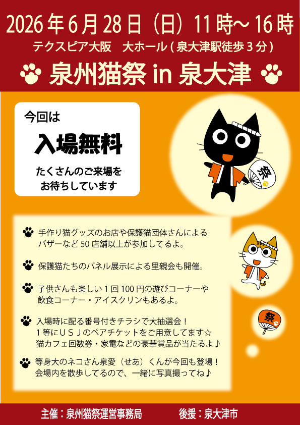 | 開催趣旨 | 泉州猫祭は、かわいい猫グッズを見て回ったり、 遊びコーナー・飲食コーナー・大抽選会などを楽しみがら、 泉州地域の保護猫活動に目を向けて頂けるような 啓発イベントを目指しています。 |